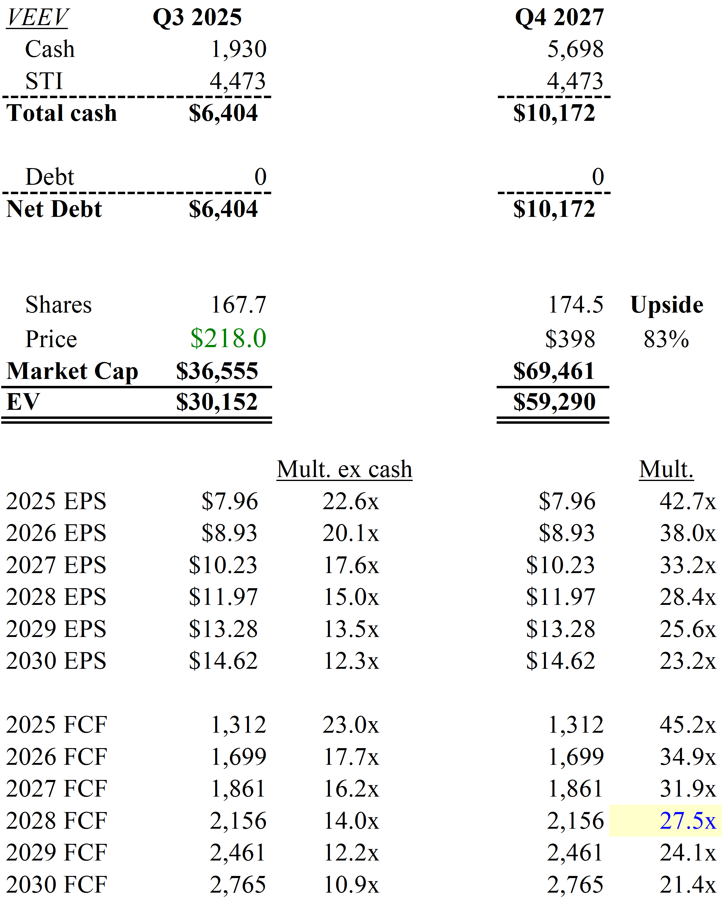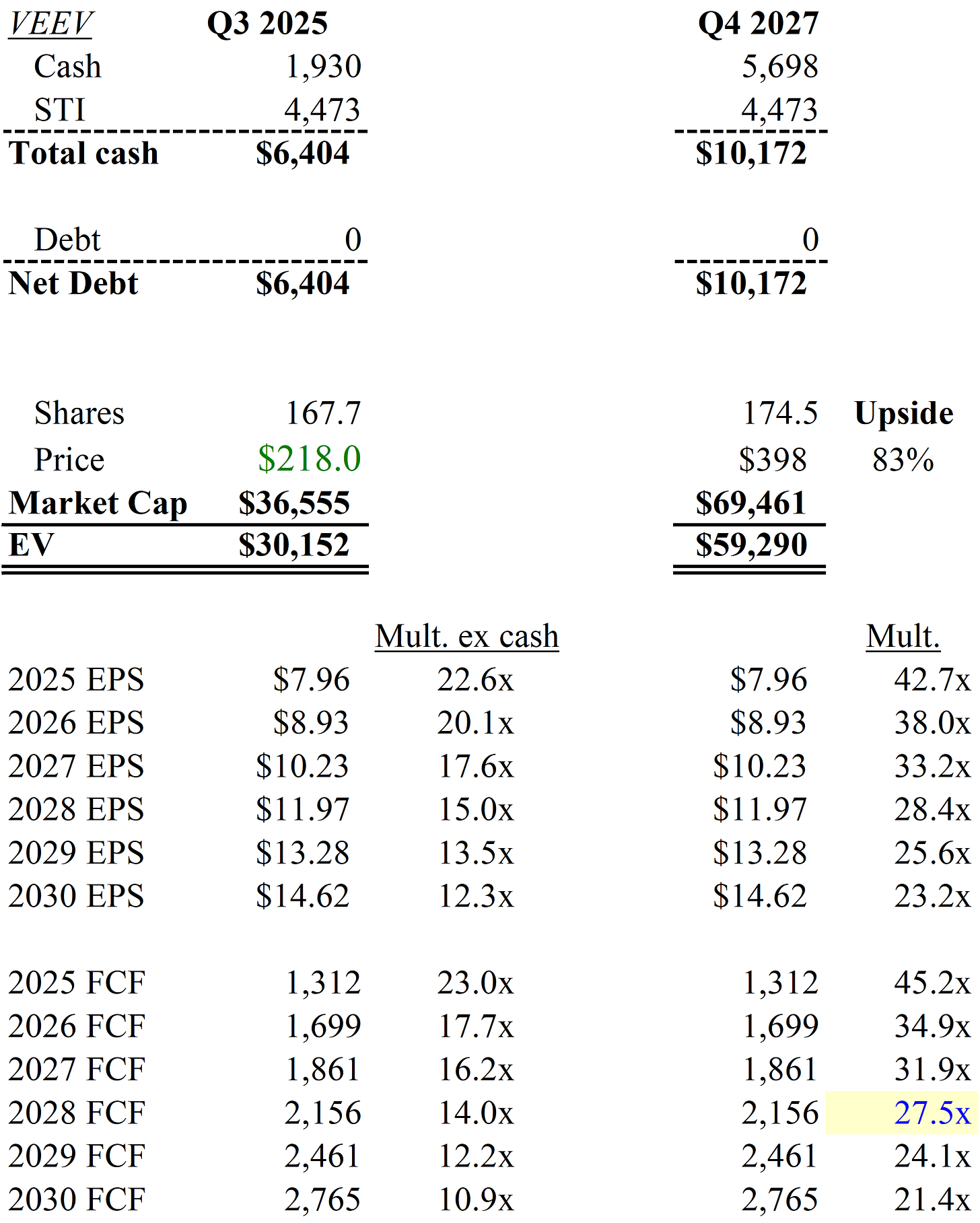 My temporal target is ~24 months (so end of CY 2027), when competitive fears in CRM have subsided and the market has digested that VEEV is actually an AI winner. I expect a re-rating toward historical FCF multiples (high-20s) as the market digests the AI-driven R&D growth and CRM stabilization. By mid 2028, the equity will be worth ~$400 or 83% higher than current levels, representing a 27% IRR to 6/30/2028.