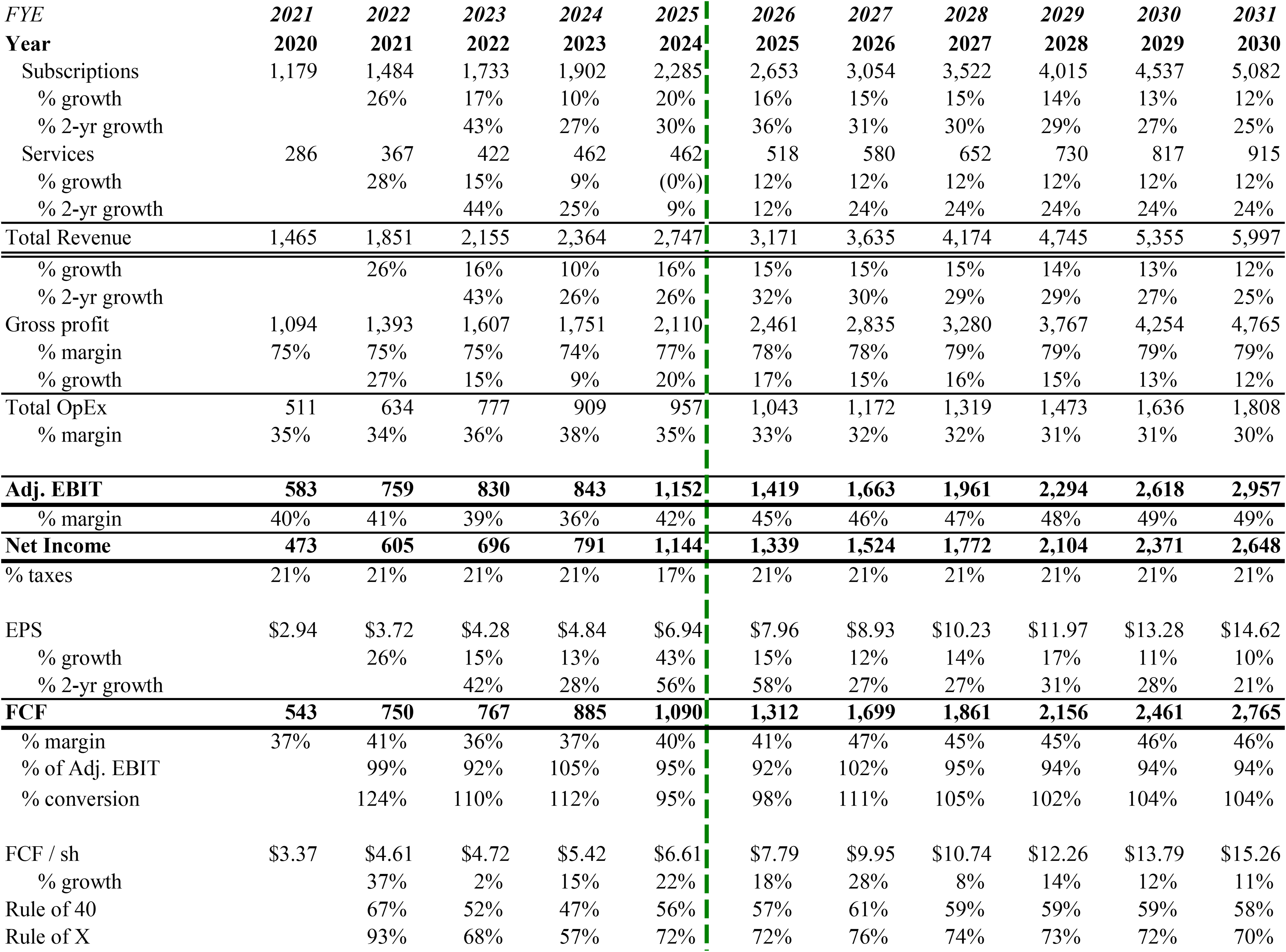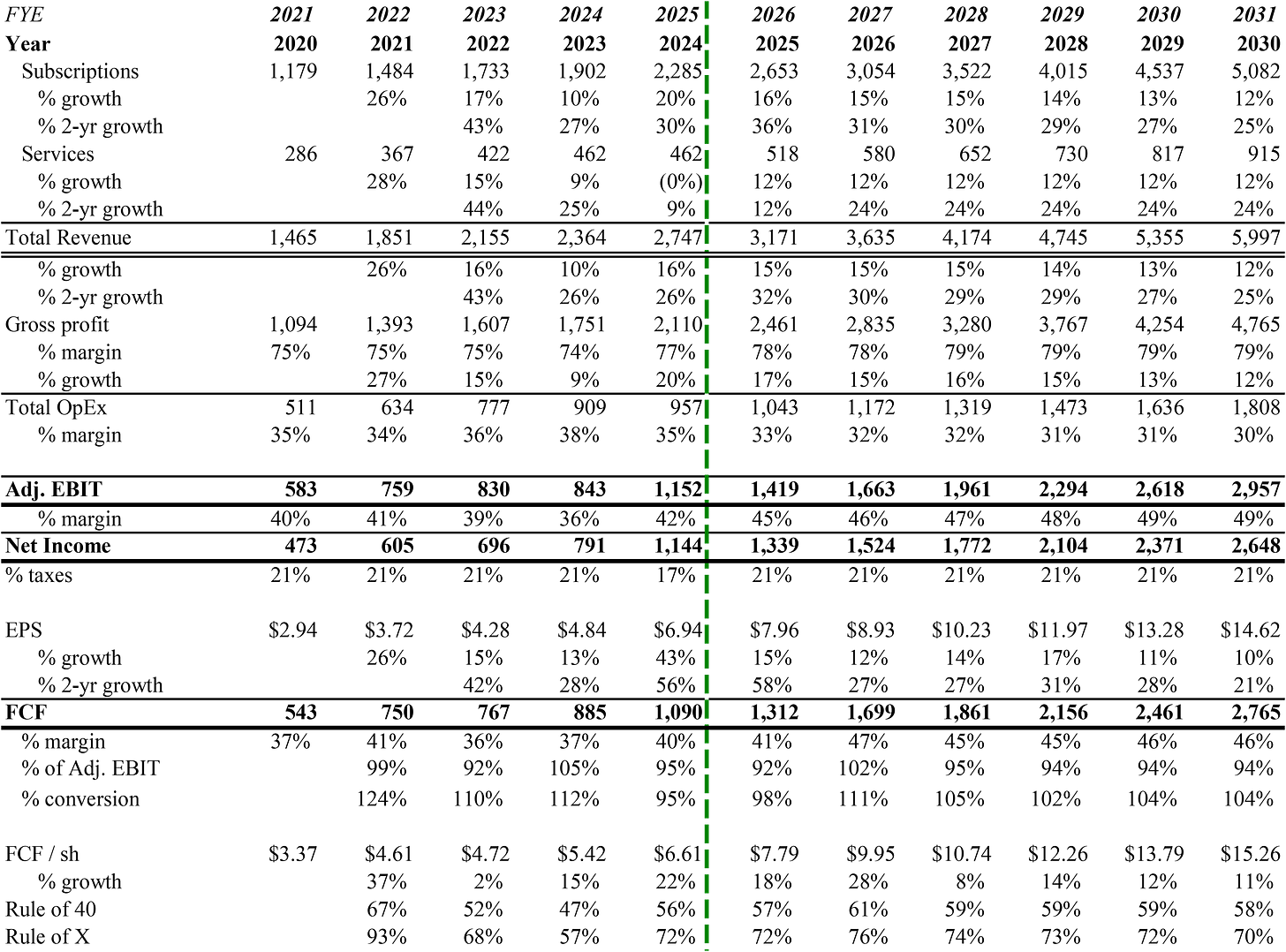 See my financial model and projections below. Management expects $6bn of run rate revenue by 2030 as they improve clinical productivity across life sciences by 20% over this period. I view their goal of >35% adj. EBIT margin as a pure floor and believe that it could trend toward 50%. I think the company can sustain 15% revenue growth over the next 24m, with potential further upside from the IQVIA partnership (a quiet positive where IQVIA data can now feed seamlessly into Veeva CRM, and IQVIA’s CRO can now use Veeva products) and AI product launches.